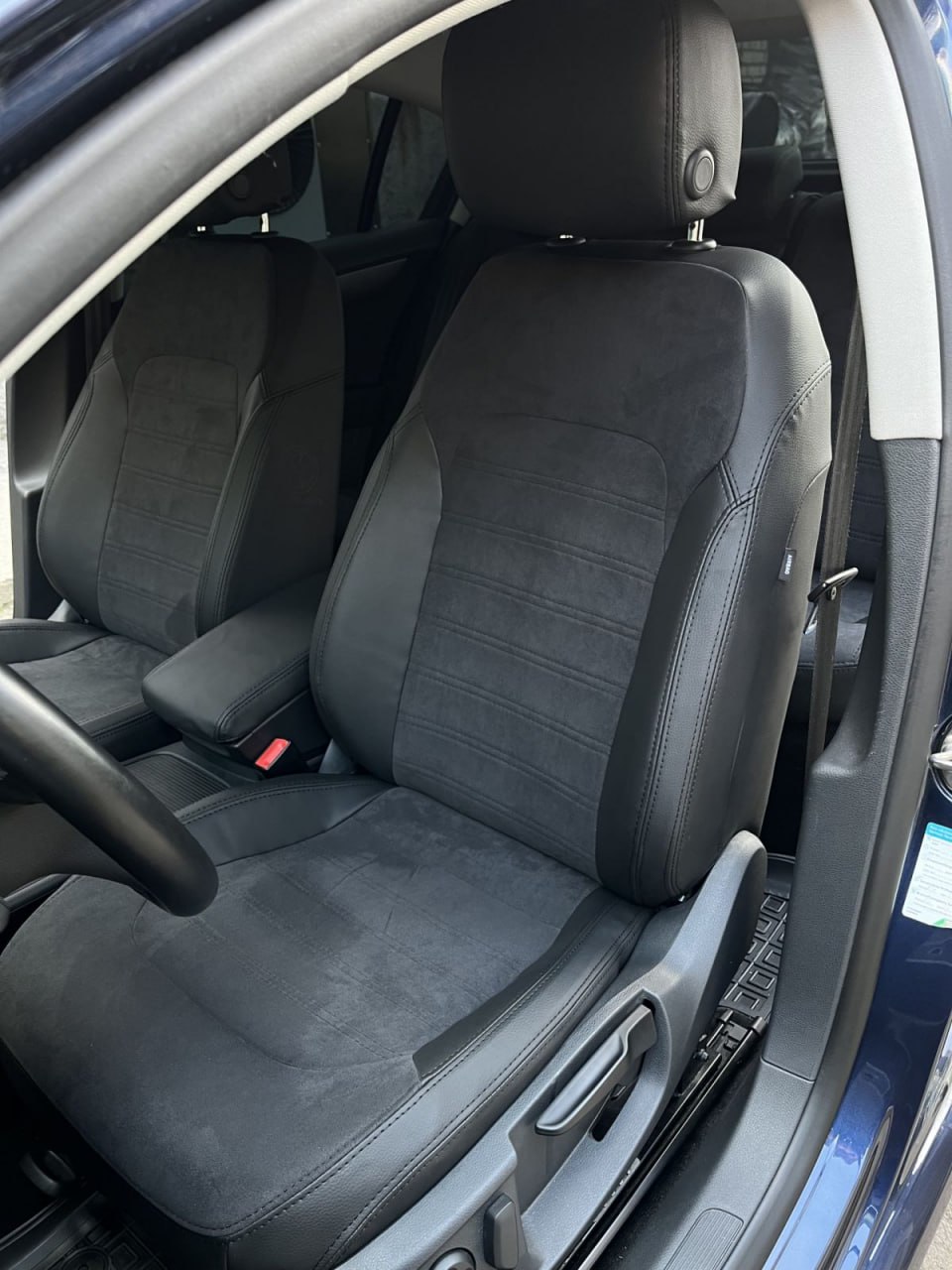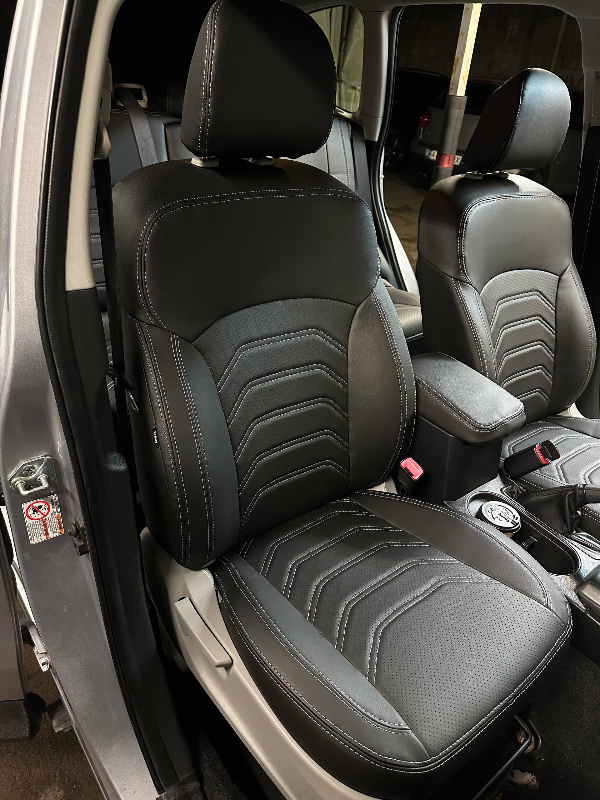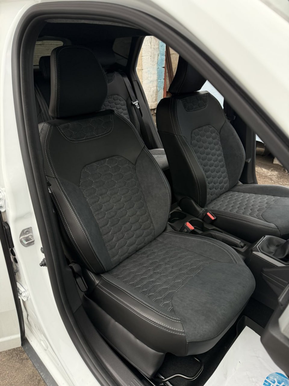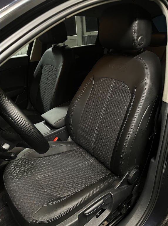 Czarna ekoskóra, czarna alcantara tłoczona w romby, jasnoszara nić, logo.