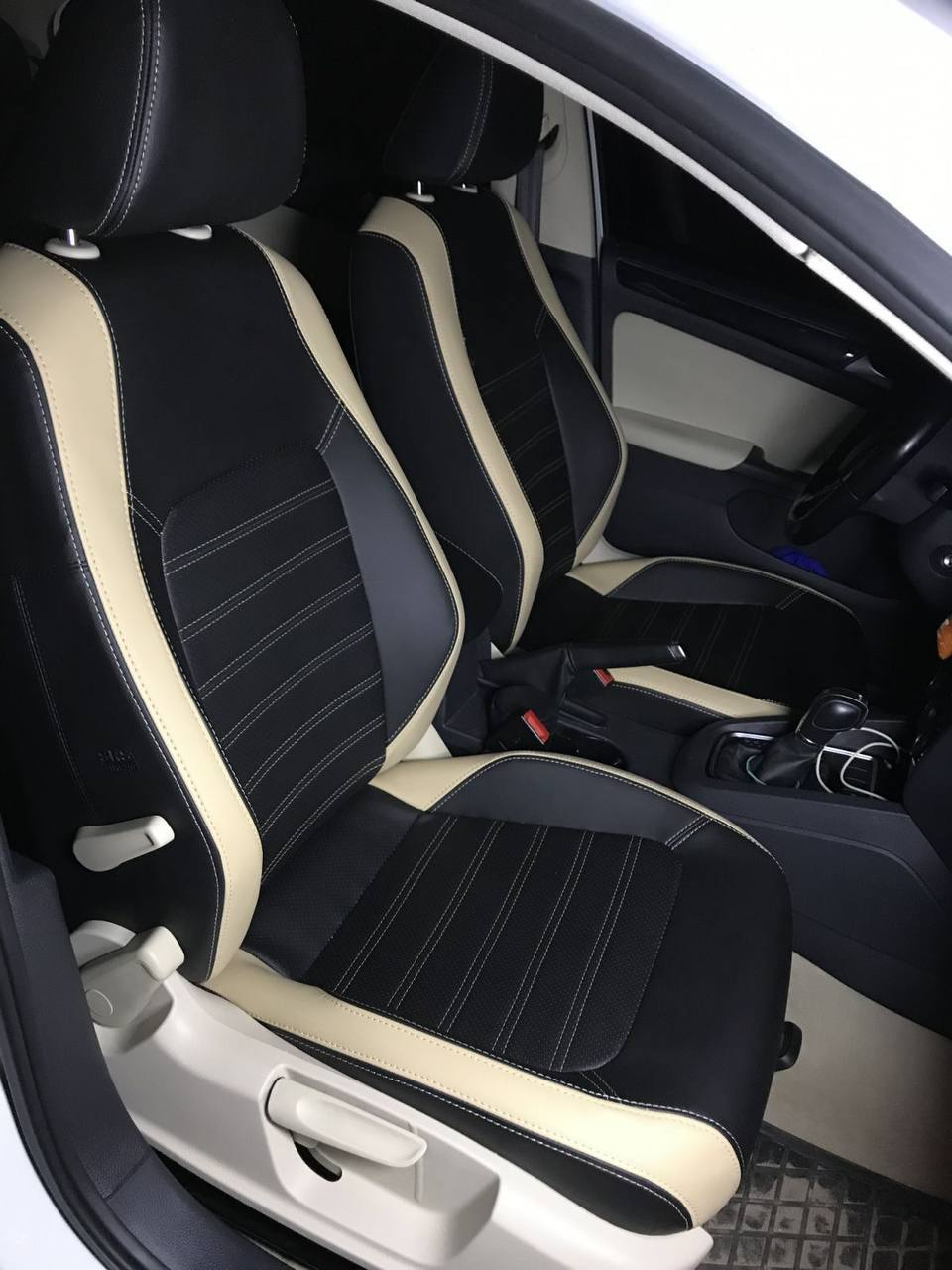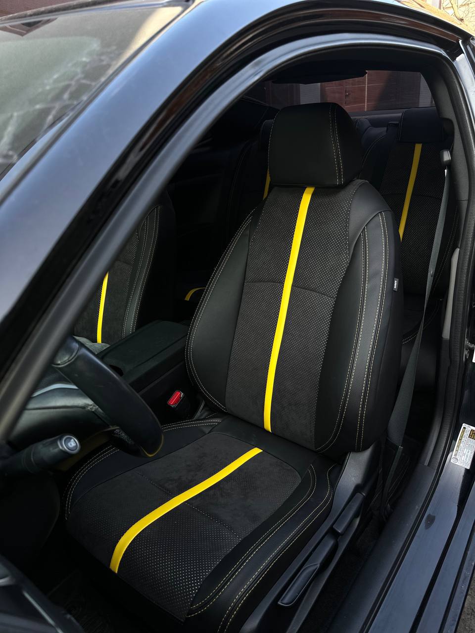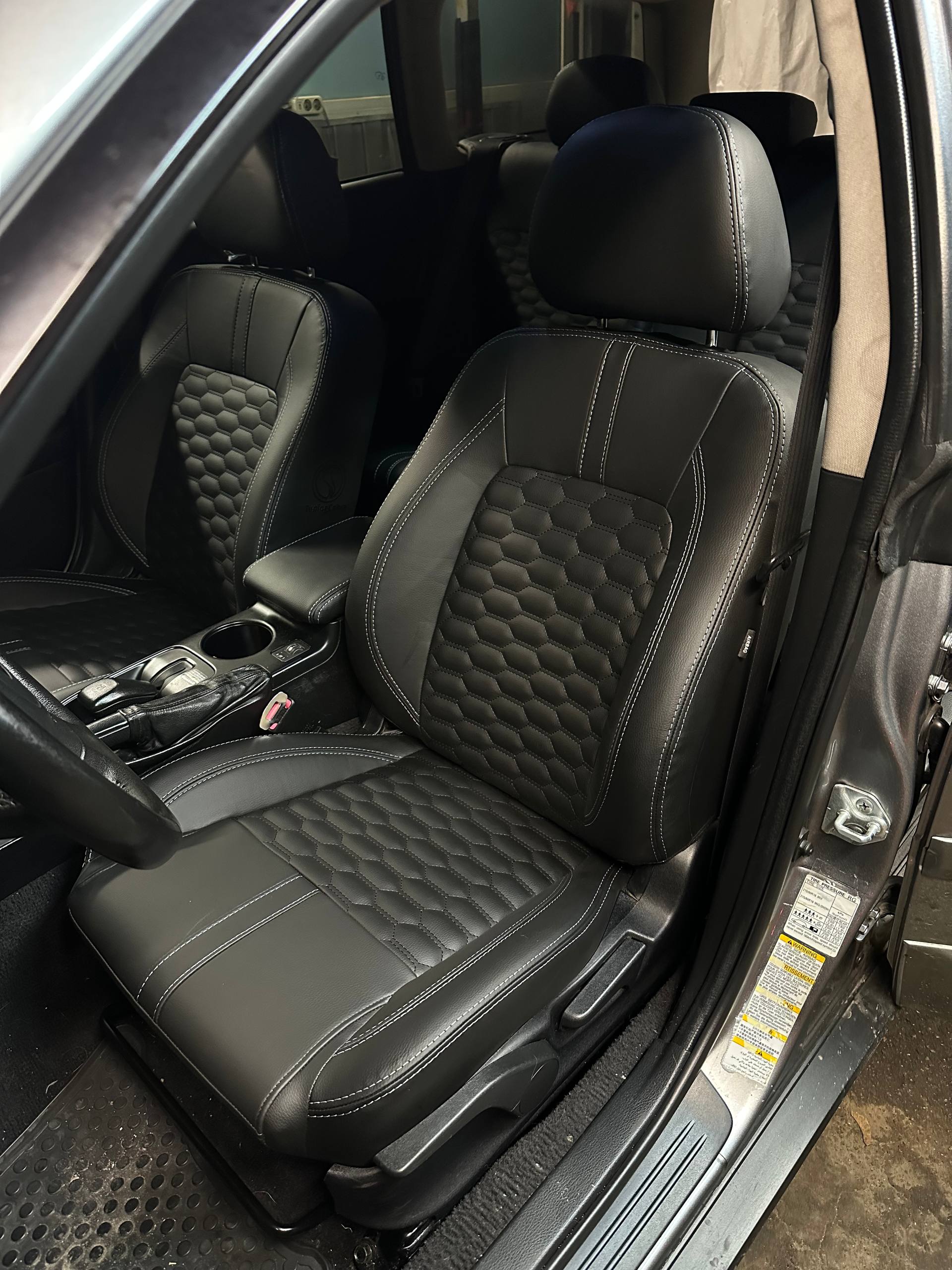 Czarna ekoskóra, czarna alcantara tłoczona w romby, jasnoszara nić, logo.